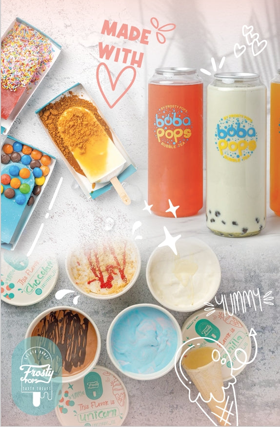 WLECOME TO FROSTY POPS. YOUR DESTINATION FOR GEALTO, POPSICLES, AND BUBBLE TEA.
